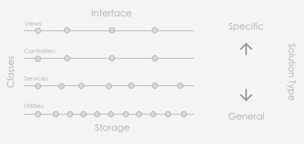 Throw a dart anywhere in the hierarchy and the code above looks to be solving specific problems while the code below looks to be solving general problems. If you move down the hierarchy and look up, the nodes that you saw to be solving general problems now look to be solving specific problems.